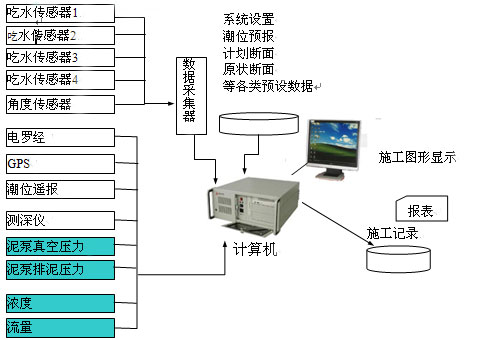 绞吸挖泥船施工辅助系统(即水下施工剖面显示系统)是针对绞吸式挖泥船施工过程中的具体特点研制开发的。由于绞吸式挖泥船在挖泥操纵时,往往很难通过目视对水下铰刀进行实物观察,也无法正确了解实际的铰刀位置及挖泥深度。因此,对操作人员经验的依赖性强,且较难保证施工效率始终处于最佳状态。此外,施工中各项指标量化程度低,缺乏连续,全面的记录,难于对施工经验进行充分积累与量化分析。本产品结合以往的开发、使用经验,通过计算机系统采集钢桩台车、横移绞车、铰刀架绞车、船舶吃水、桥臂角度等数据,在彩色显示器上用彩色模拟图显示船舶、铰刀的位置变化,同时用数字方式将数据显示出来,使操纵人员无须离开操纵台即可正确了解实际的船舶和铰刀状态,实时监视整个工作过程,为施工过程提供了有力的帮助。